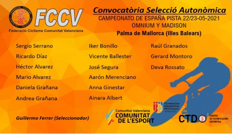 El seleccionador autonomico de Pista, Guillermo Ferrer, ha convocado a 15 pistards para el Campeonato de España de Pista que se disputa en Palma de Mallorca los días 22 y 23 de mayo bajo las modalidades de omnium y madison. Se trata de Sergio Serrano, Ricardo Díaz, Héctor Álvarez, Mario Álvarez, Daniela Grañana, Andrea Grañana, Iker Bonillo, Vicente Ballester, José Segura, Aarón Merenciano, Anna Ginestar, Ainara Albert, Raúl Granados, Gerard Montoro y Deva Rossato.