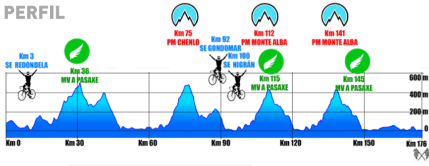 Primero se ascenderá a Prado por Chenlo, un puerto de 4,2 kilómetros al 6,1% y, tras bajar por Couso y Gondomar, se tocará la carretera de la costa para entrar en el bucle circular de Nigrán de, aproximadamente, 30 kilómetros. De ellos, 9,47 corresponden a la subida al Alba desde la rúa dos Pazos. La pendiente media queda en el 4% por los tramos de descanso y bajada, pero hay varias zonas del 8 y 9%. Después, regresa a Nigrán a través de A Pasaxe y Vincios en descenso –otros 10 kilómetros– y queda otro tercio del tramo circular más o menos llano entre Gondomar, A Ramallosa y Nigrán. Los equipos realizarán en dos ocasiones este trazado antes de volver a Vigo.