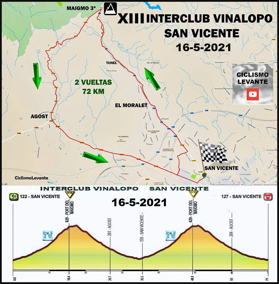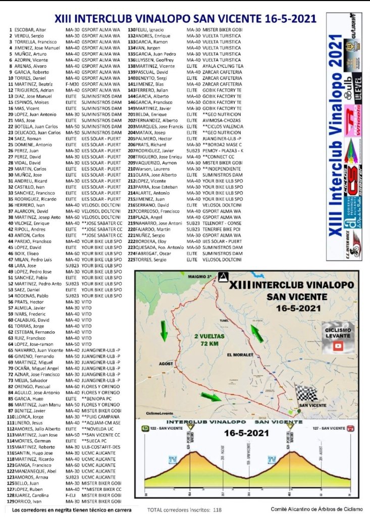 El domingo, 16 de mayo, se disputa en San Vicente del Raspeing, la última etapa del XIII Interclubs Vinalopó. El pelotón partirá a las diez de la mañana y tendrá por delante 72 kikómetros. Se darán dos vueltas a un circuito en el que habrá que superar el puerto del Maigmó de tercera categoría. Aitor Escobar es el líder el Torneo a falta de una jornada para el final. Tiene 44 segundos de ventaja sobre David López (Your Bikes), que es el primer élite. Escobar comanda también la clasificación de los M30; Fernando Esteban (Vito), la de los M40; Fernando Gimeno (JuanGiner), los M50; Pascual Orengo (Orengo), la de los M60; Raúl Peñaranda (Guijarro), la de los júniors; y Carolina Juárez (Mister Biker), la de las féminas. El Ijes Solar es el mejor equipo, Álex Sempere lleva el maillot de la montaña, Antonio Domene, el de las metas volantes y Aitor Escobar el de la regularidad.