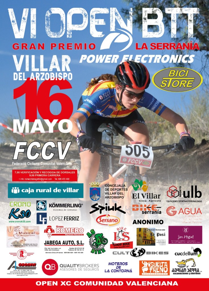 La localidad de Villar del Arzobispo acoge el domingo, día 16, el VII Open BTT-Gran Premio La Serranía. La primera prueba puntuable para el Open BTT XCO de la Comunitat Valenciana, se disputará a partir de las nueve de la mañana. A esa hora partirán los máster 30, 40, 50 y 60, además de las féminas y cadetes. A las 10.30 tendrán protagonismo las Escuelas y, a las 12.30, competirán las categoría masculina élite, sub 23 y júnior.