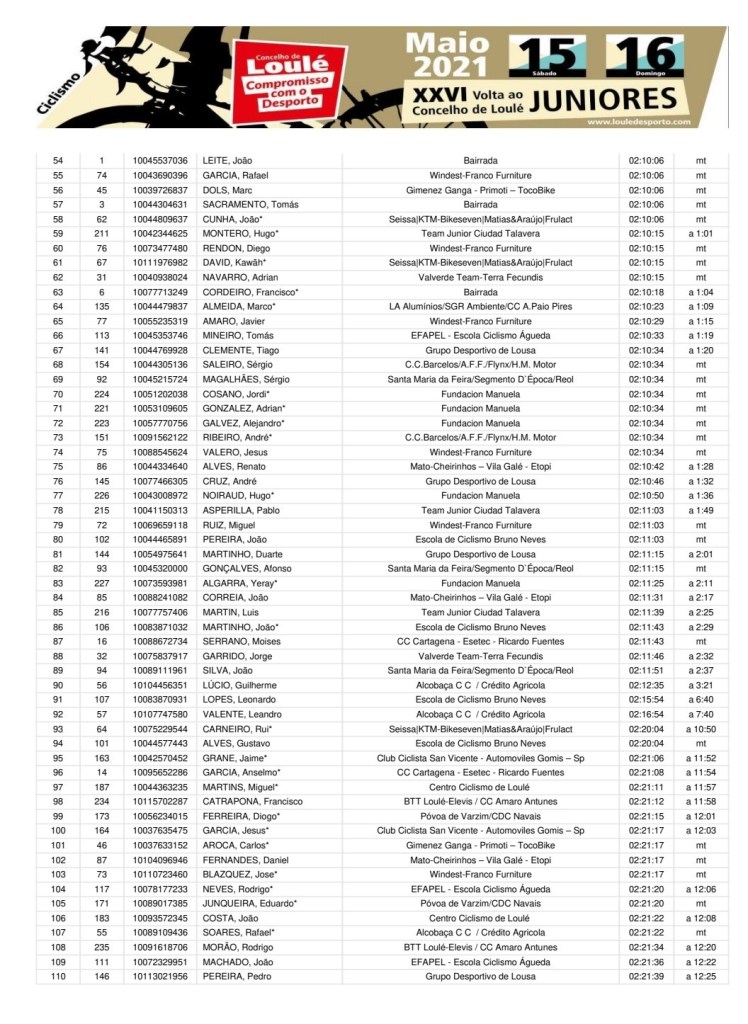 Juan Pedro Lozano (Valverde Team) se ha impuesto hoy en la primera etapa de la XXVI Volta ao Concelho de Loulé para corredores júniors. Su tiempo ha sido de dos horas, nueve minutos y 14 segundos. Antonio Morgado (Bairrada) y Daniel Lima (CC de Loulé) le han acompañado en el podio. Javier Morante, en el puesto 18, ha sido el mejor del Guijarro Sporting Pursuits, y Sergi Amengual, en la plaza 21, del Giménez Ganga.