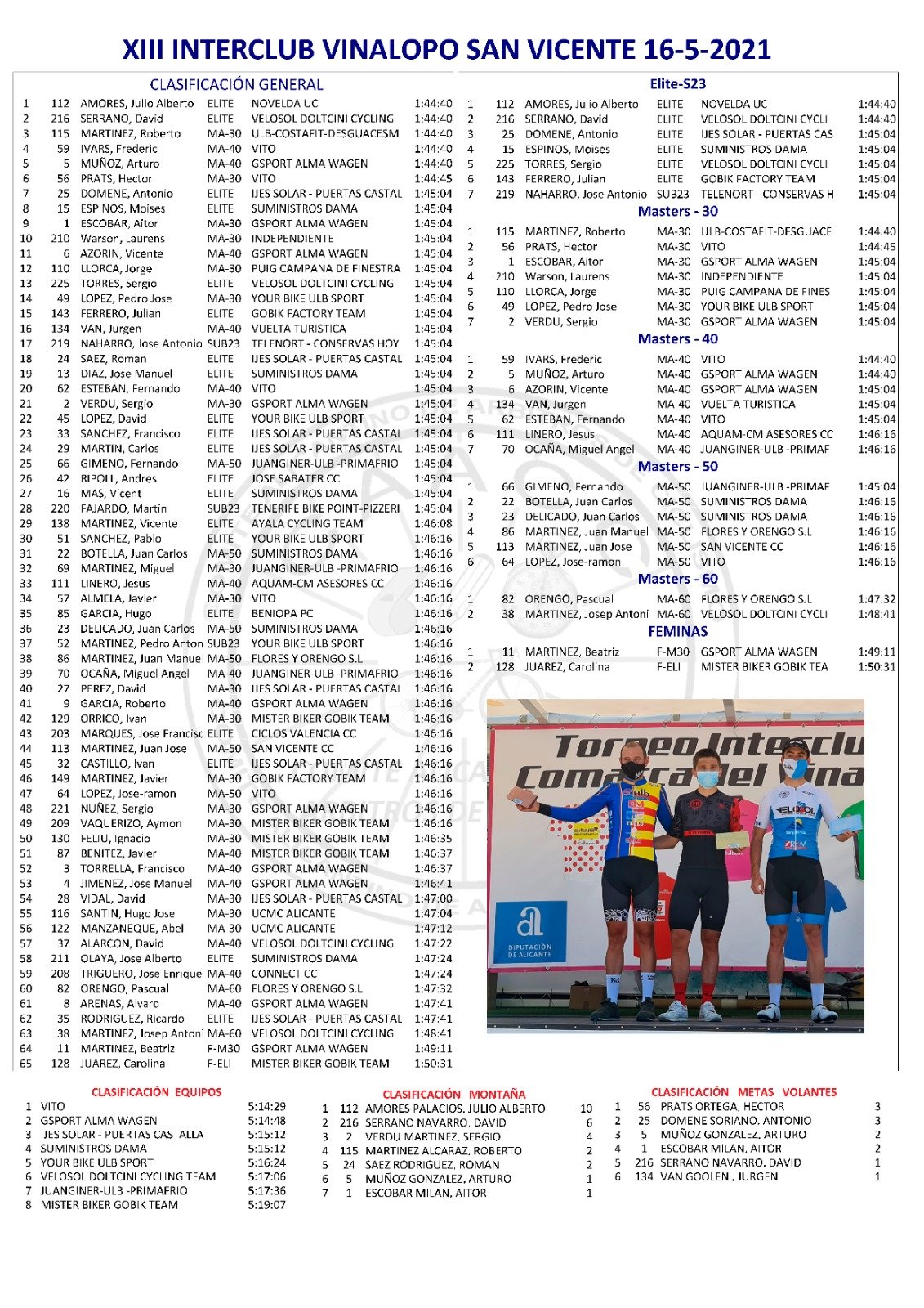 Aitor Escobar ha sido el ganador absoluto y primer M30; David López (Your Bike) gana en la categoría élite; Fernando Esteban (Vito) entre los M40; Fernando Gimeno (Juan Giner) ha sido el mejor M50; Pascual Orengo (Flores), en M60; y Cristina Juárez (Mister Biker), en féminas. Ijes Solar ha sido el mejor equipo, Alex Sempere (Geo Nutrición) se ha llevado el maillot de la montaña, Antonio Domene (Ijes Solar) el de las metas volantes y Aitor Escobar el de la regularidad.