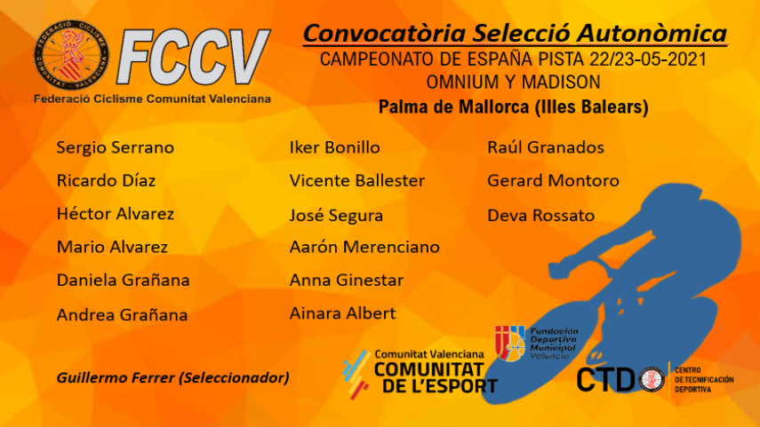 El seleccionador autonomico de Pista de la Comunitat Valenciana, Guillermo Ferrer, ha convocado a 15 pistards. Se trata de Sergio Serrano, Ricardo Díaz, Héctor Álvarez (Grupo Sime), Mario Álvarez (Grupo Sime), Daniela Grañana, Andrea Grañana, Iker Bonillo, Vicente Ballester, José Segura (Manuela Fundación), Aarón Merenciano (Infinobras), Anna Ginestar (International Cycling Academy), Ainara Albert, Raúl Granados (Cartagena), Gerard Montoro (Manuela Fundación) y Deva Rossato (International Cycling Academy). Ayer entrenaron en Valencia y el viernes vuelan a Mallorca.