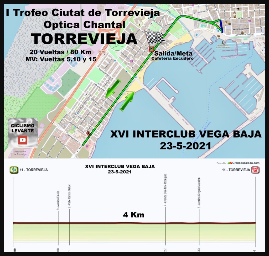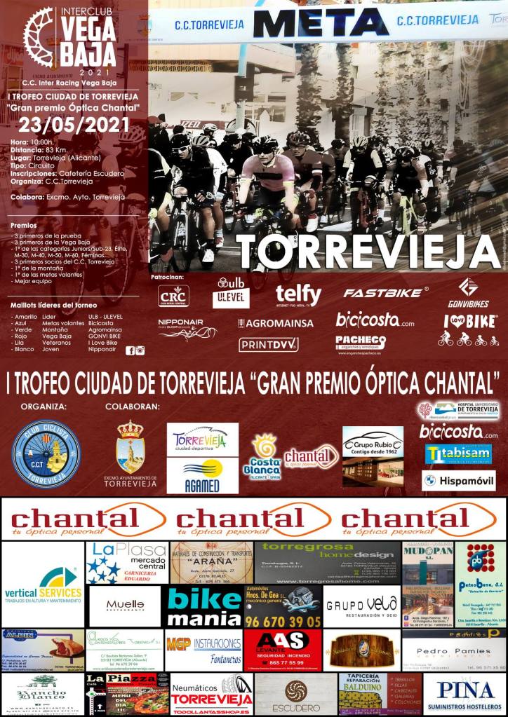 El domingo, 23 de mayo, se celebrará, a partir de las diez, la segunda prueba del XXVI Interclub Vega Baja, el I Trofeo «Ciudad de Torrevieja-Gran Premio Óptica Chantal». El Club Ciclista Torrevieja-Cycling Team, organizador de la prueba, ha diseñado un circuito urbano de 4,17 kilómetros. Se darán 30 vueltas hasta completar los 83,4 kilómetros. La línea de Salida/Meta estará situada en la Avda/Dr. Gregorio Marañón nº37. Se espera la participación de 200 ciclistas de las categorías féminas, junior, élite-sub23, Máster-30, Máster-40, Máster-50 y Máster-60.