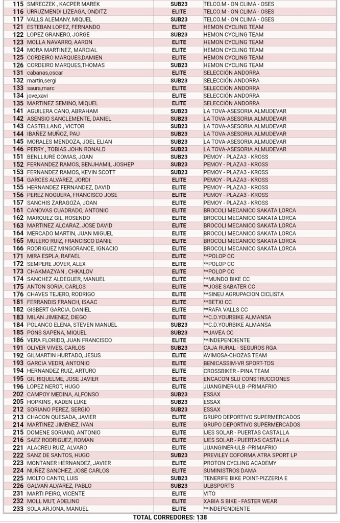 Aparecen en la lista de inscritos también los conjuntos La Tova-Asesoría Almudevar, JuanGiner Ulb, Team Smartdry, Arabay Team, Antiga Casa Bellsola-Girona, Telcom On Clima, Pemoy Plaza 3, Cartagena Esetec (Raúl Granados y Antonio Lozano), Brócoli Mecánico, Real Sitio de Aranjuez, GD Supermercados, Ciclos Oleka, Manuela Fundación, Ciclismo Extremo Perú, Lescar V Sprint, Selección Andorra, Yourbike.