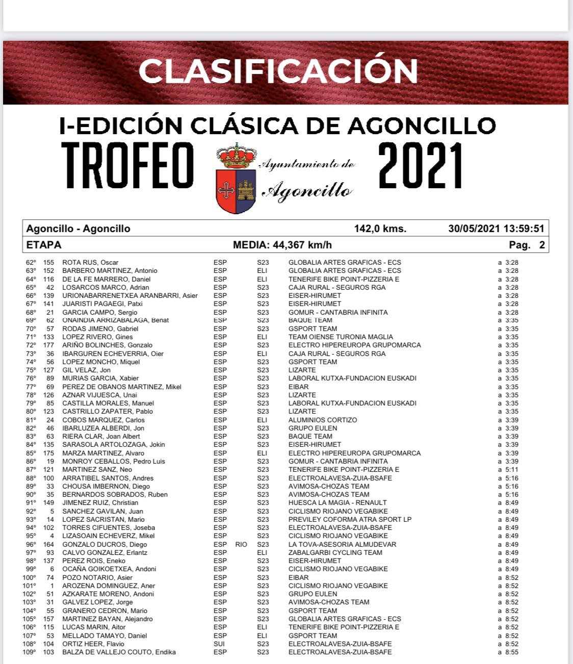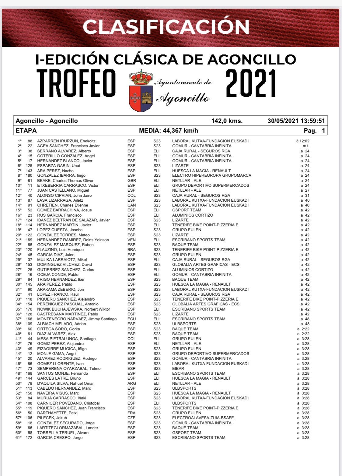 Enekoitz Azparren (Laboral Kutxa) se ha adjudicado hoy la primera edición de la Clásica de Agoncillo tras imponerse al esprint a su compañero de escapada Francisco Javier Agea (Gomur-Cantabria Infinita). Ambos se fueron sólo hacia meta tras dejar a un reducido grupo en el que iban los Netllar Alé Miguel Juan y Charlie Beake. A 24″ llegaba el pelotón encabezado por Alberto Serrano (Caja Rural-RGA) que subió al podio. Miguel Juan terminó en el puesto once. «La selección se hizo en el primer puerto y aguantamos Charlie y yo. Pero, llegando a meta, se nos fueron el corredor del Laboral y el Gomur. He recuperado sensaciones, pero me faltó cabeza al final porque dejamos que se nos fueran dos en la zona decisiva de la jornada», comentaba el alteano.
