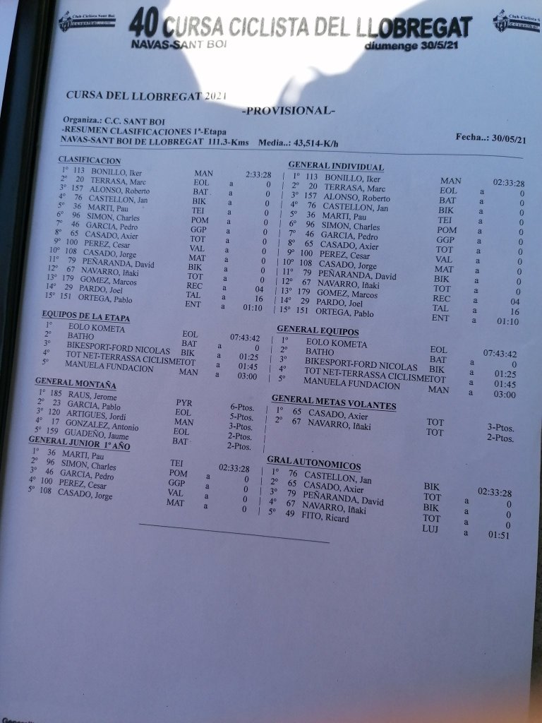La edición 2021 de la Copa de España Júnior Cofidis ha dado comienzo hoy con la disputa de la 40ª Cursa Ciclista del Llobregat “Navas-Sant Boi”, que proponía un bonito recorrido de 111 kilómetros en el que Iker Bonillo ha logrado la victoria tras ser el más rápido de un pequeño grupo que ha logrado llegar con ventaja a la línea de meta. Segundo ha sido Marc Terrasa, otro ciclista muy rápido y medallista en la prueba de Madison del Campeonato de Europa de Pista de la categoría; mientras que en tercera plaza ha concluido Roberto Alonso. Séptimo puesto para el corredor del Giménez Ganga Gio Alicante Primoti, Pedro García, que llegó con el grupo de los elegidos. «La carrera me ha parecido muy bonita, pero dura. Al final he logrado entrar con el grupo de los escapados en los últimos 10 kilómetros y he conseguido la 7ª posicion en el esprint», señalaba el corredor de Jumilla.
