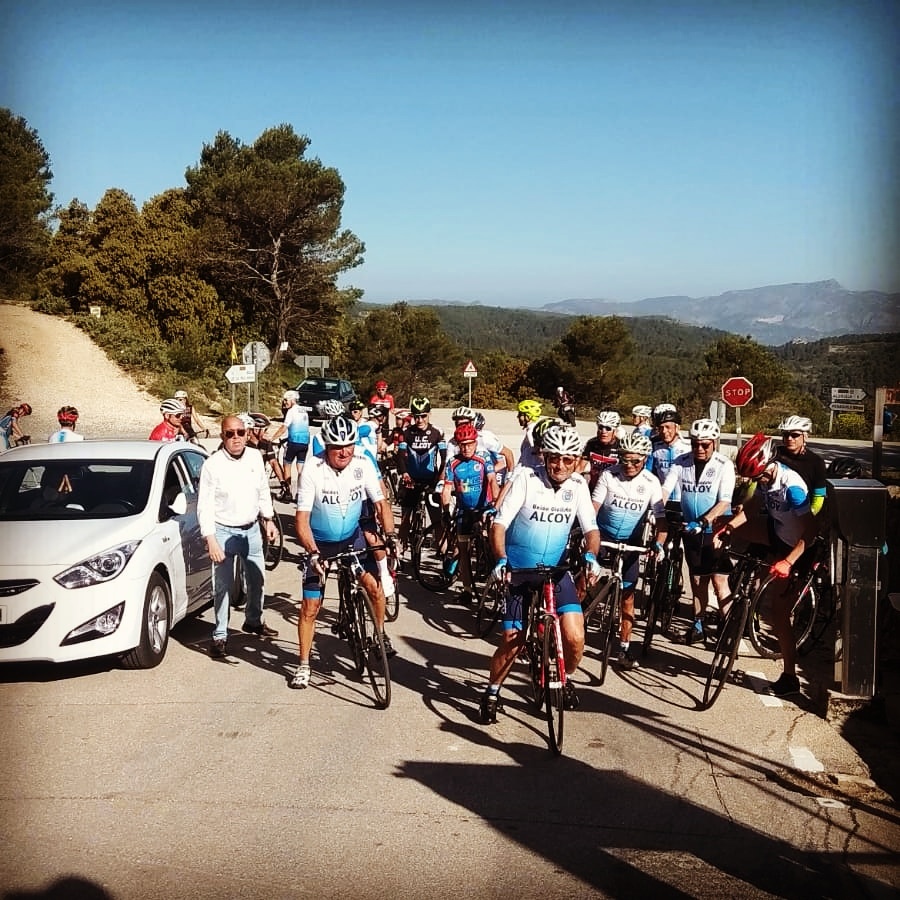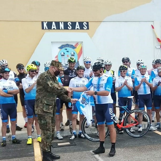 El pasado sábado medio centenar de socios de la Unión Ciclista Alcoy realizaron la subida a la base Aitana EVA 5 dentro de los actos conmemorativos del 60 aniversario de la UCA. Una fecha que coincidido con la celebración del día de las Fuerzas Armadas. Después de una exigente y bonita ascensión hasta la cima la entidad alcoyana obsequió con un maillot al personal de la base de que, según fuentes de club, “ nos recibió con los brazos abiertos y nos dio un trato exquisito”.