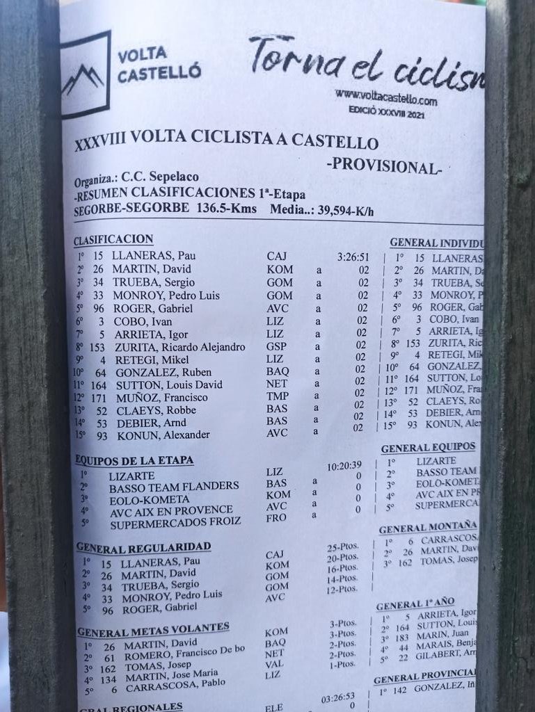 En las clasificaciones secundarias, Lizarte se alzó como mejor equipo, Igor Arrieta (Lizarte) como mejor corredor de primer año, Gonzalo Ariño como mejor castellonense, Eugenio Sánchez como mejor valenciano y David Martín vencedor de las metas volantes. Pau Llaneras, que consigue aquí su mejor victoria hasta la fecha, deberá defender el liderato en la general y también el maillot de la regularidad.