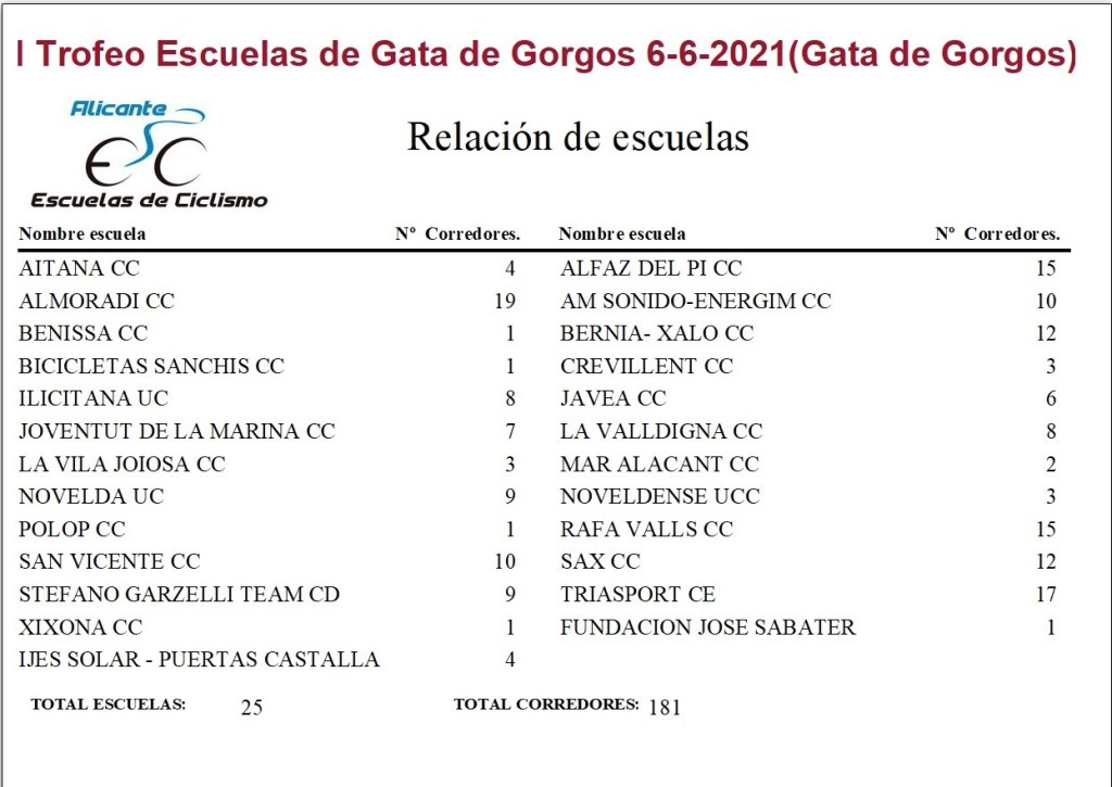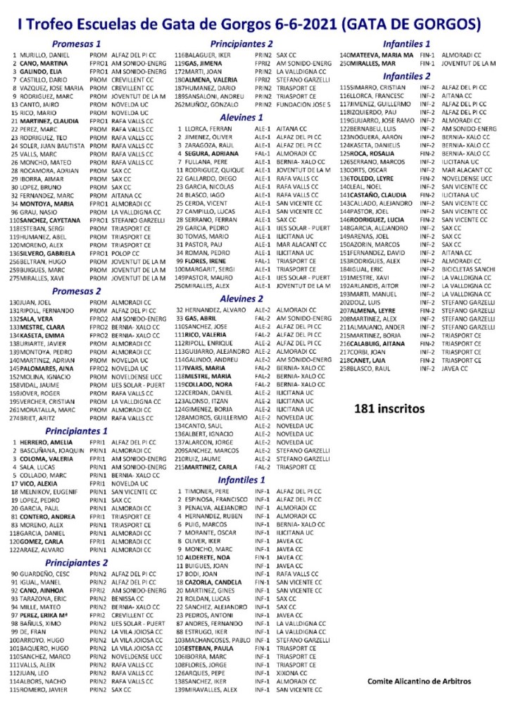 Gracias al Ayuntamiento y a un gran número de colaboradores y esponsors se pone en marcha la prueba que a buen seguro hará las delicias de los más pequeños. Se espera la participación 181 participantes pertenecientes a 25 escuelas. LISTA DE INSCRITOS (Fuente. Ciclismo Levante).