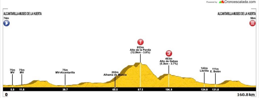Este año, el recorrido es de 160 kilómetros y consta inicialmente de dos vueltas al circuito urbano, por la calle Mayor y la avenida Príncipe con dos metas volantes, tras lo cual los ciclistas saldrán hacia Sangonera la Seca para volver a entrar en Alcantarilla y salir de nuevo hacia Sangonera la Verde, Casas Nuevas, Alhama, Pliego, Fuente Librilla, Librilla y vuelta a Alcantarilla para iniciar el circuito urbano final.