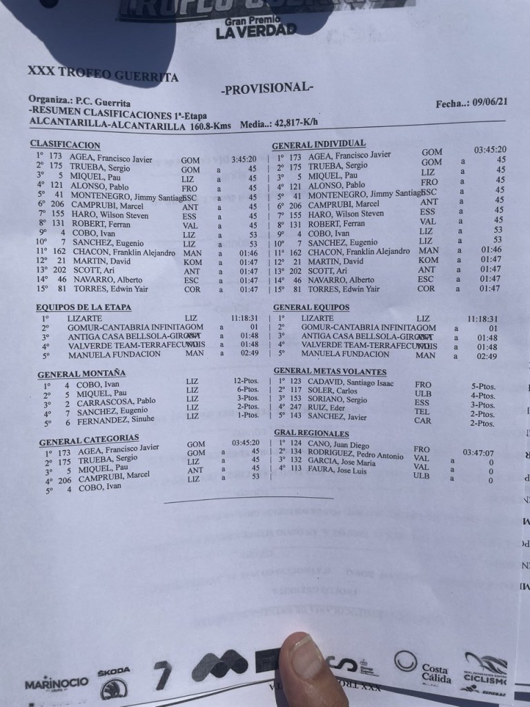 Francisco Agea (Equipo Gomur) ha hecho buena la escapada final y ha conquistado la XXX edición de Trofeo Guerrita disputado sobre una distancia de 160,8 kilómetros con salida y meta en Alcantarilla. Su compañero de escuadra Sergio Trueba ha sido segundo y Pau Miquel (Lizarte Team), tercero. Miquel se consolida como líder de la Copa España élite y sub 23. Steven Haro (Equipo Essax) ha sido séptimo y Eugenio Sánchez, décimo. Ambos han entrado en el pelotón perseguidor. Gran trabajo del alicantino para que la escapada llegara a meta y que «Pau le quitara puntos a Brutenga» en la clasificación de la Copa España élite y sub 23. Lizarte ha sido el mejor equipo, Iván Cobo (Lizarte) se ha hecho con el premio de la montaña y Santiago Egea Cadavid (Froiz), las metas volantes.