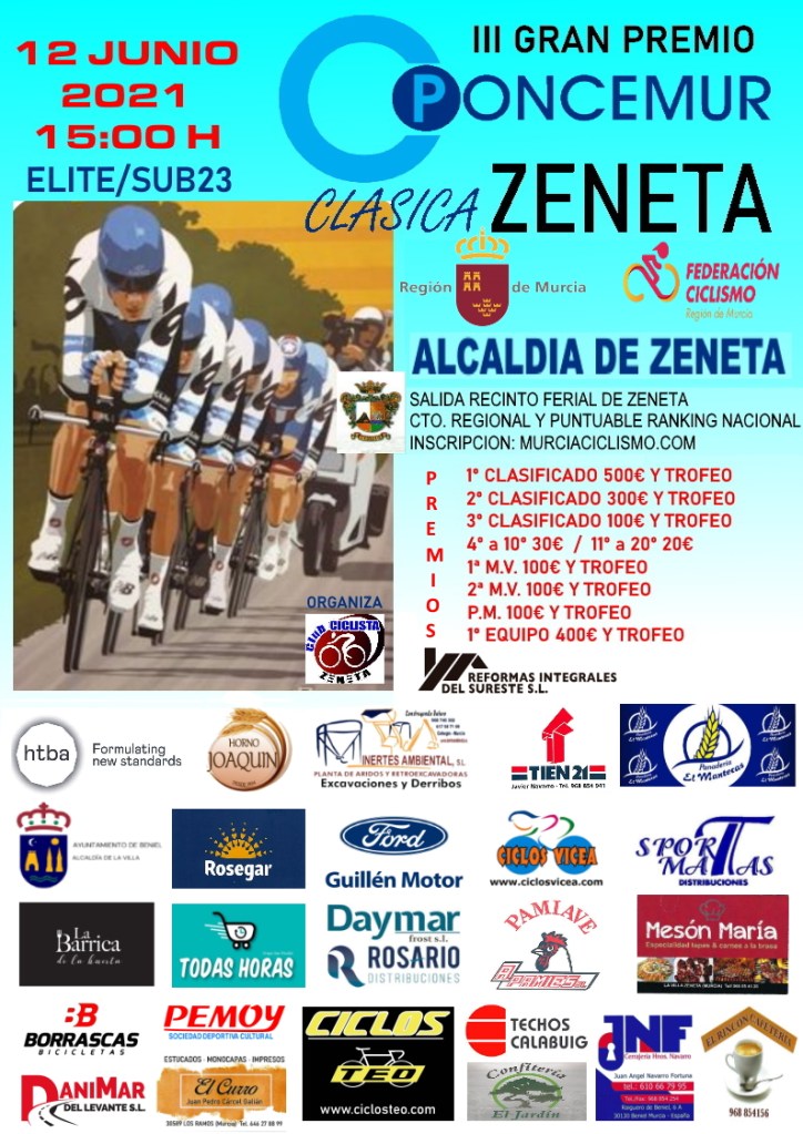 El sábado también se disputa el III GP Poncemur-Clásica de Zeneta, con su exigente recorrido de 115 kilómetros que incluye la doble ascensión al alto de Cabezo de la Plata. Además de la localidad de Zeneta saldrán los nuevos campeones regionales élite y sub’23 de Murcia. Josué Gómez (Gsport), ganador de la última edición, es uno de los favoritos. Junto a él estará su compañero de escuadra Mario Granero, además de Raúl Granados y Antonio Lozano (Cartagena). El Netllar Alé estará con Alejandro Gómiz, Nahuel D’ Áquila, Jorge Amorós, Carlos Mira, Álvaro Sagrado, Joe Bennet, Matt Watson y Ewan Mackie. El Essax alineará a Mikel Castellá, Sergio Soriano, Alfonso Campoy, Kaden Luke Hopkins y Luis Julián Molina.