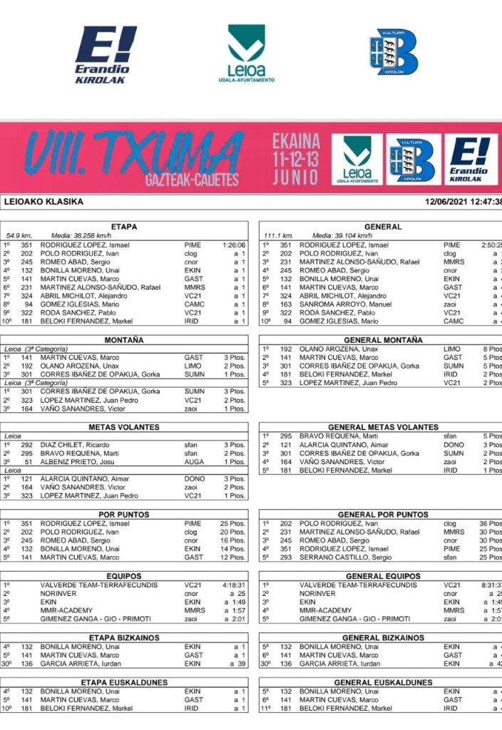 Hoy sábado en la Clásica de Leioa, de 54,9 kilómetros, Ismael Rodríguez ha conseguido unos metros de ventaja en la última recta y ha sabido mantener distancias con sus perseguidores para ganar la segunda etapa y ponerse como nuevo líder de la carrera vasca.