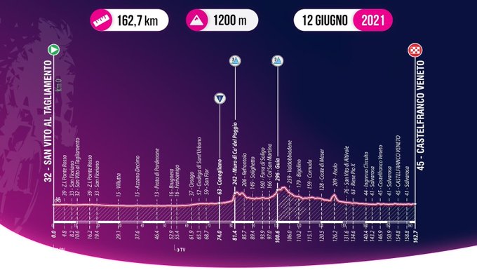 Quedan 162,7 kilómetros de recorrido entre San Vito al Tagliamento y Castelblanco Veneto. Los últimos 22 discurren en un circuito. El alicantino aventaja a Tobías Johannessen, segundo en la general, en 2’55» y a Henri Vandenabeele, tercero, en 3’49»