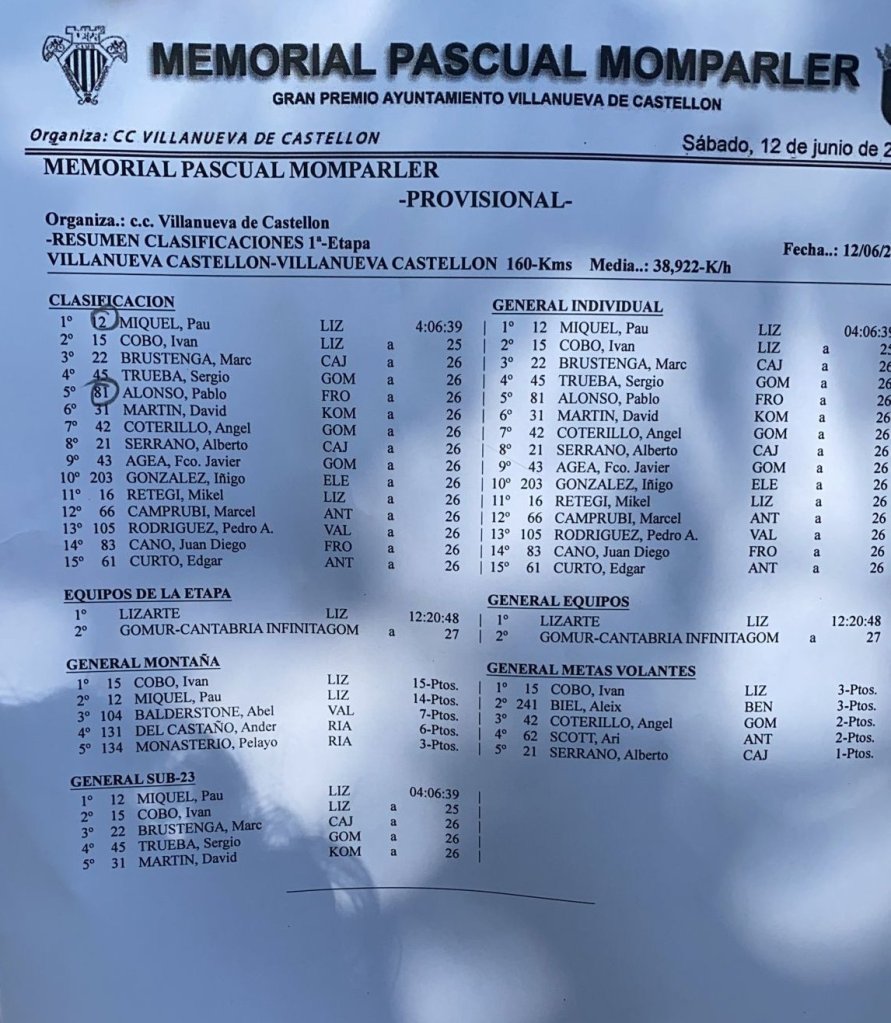 Pau Miquel (Lizarte Team) ha sido el ganador del Memorial Pascual Momparler de 158 kilómetros con salida y meta en Villanueva de Castellón. Miquel, que se fue de sus compañeros de fuga en el alto de Santa Anna, aumenta su ventaja como líder de la Copa de España élite y sub 23. El ganador ha rematado su actuación tras viajar en una escapada en la que iban su compañero Iván Cobo, además de Ángel Coterillo (Gomur), Abel Balderstone y Alexis Quinteros, del Valverde Team y David Martín (Eolo Kometa).