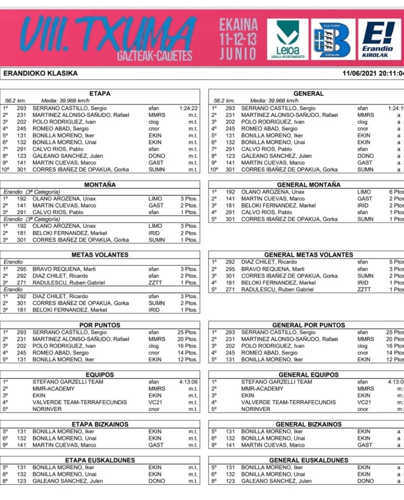 Sergio Serrano (Stefano Garzelli Team) ha sido el ganador de la primera etapa de la octava edición del VIII Memorial Txuma que se celebra hasta el domingo día 13 de junio en tierras vascas. La jornada ha tenido salida y meta en Erandio, con 56,2 kilómetros de recorrido, con la presencia de los equipos alicantinos cadetes Giménez Ganga Alicante Gio Primoti, Grupo Sime y Zafiro Team. Serrano ha sido el más rápido al esprint.
