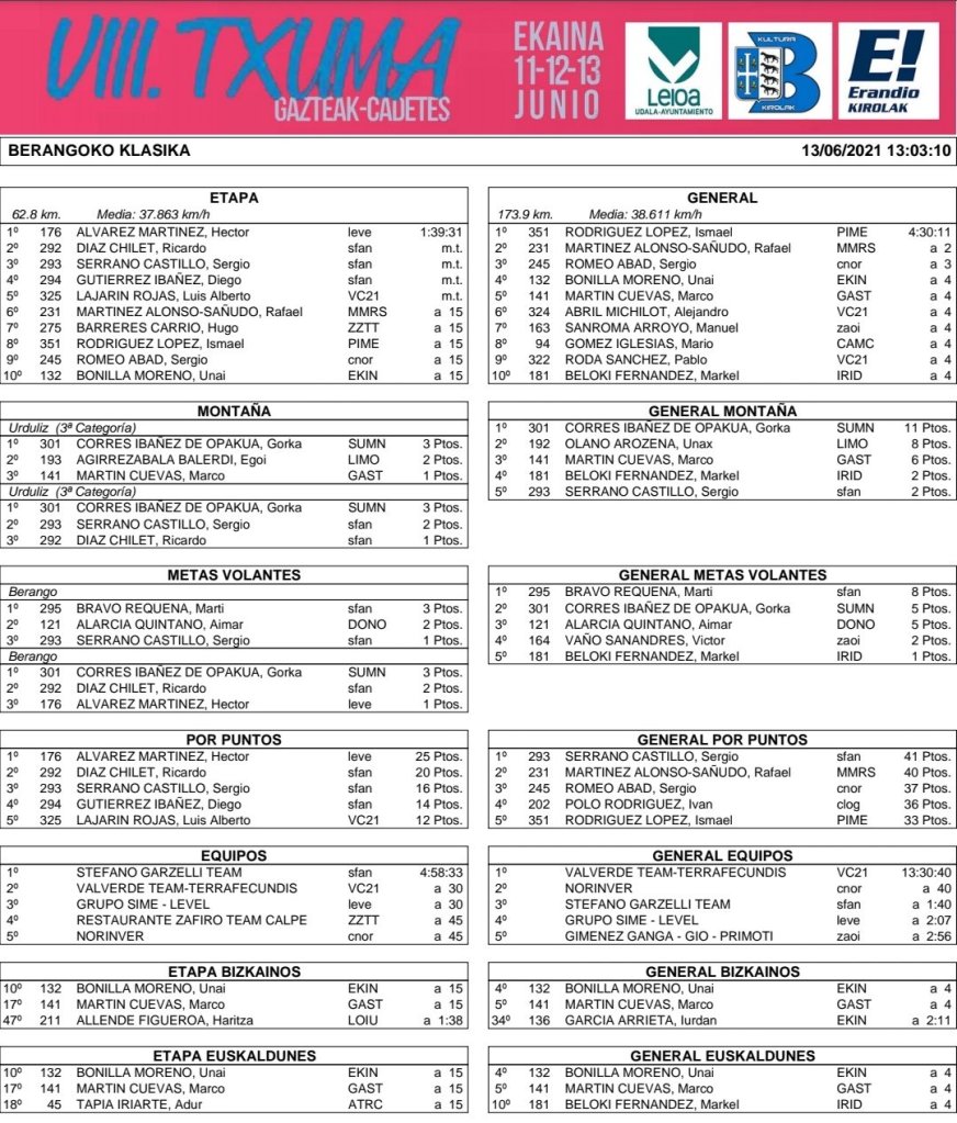 Héctor Álvarez (Grupo Sime ) ha ganado hoy en Berango la tercera etapa del Memorial Txuma de Cadetes que ha organizado la Sociedad Elkar Kirolak, con el patrocinio principal de los Ayuntamientos de Erandio, Leioa y Berango, y que ha ganado en su general final el ciclista del Corbatas Pindal, Ismael Rodríguez, vencedor de la segunda etapa en Leioa. El corredor benidormense llegó escapado a meta, con tres corredores del Stefano Garzelli, y pese a su superioridad numérica les ganó la partida tanto a ellos como a Luis Alberto Lanjarín, que viajaba con ellos. En la general, Manuel Sanroma, del Giménez Ganga, ha sido séptimo.