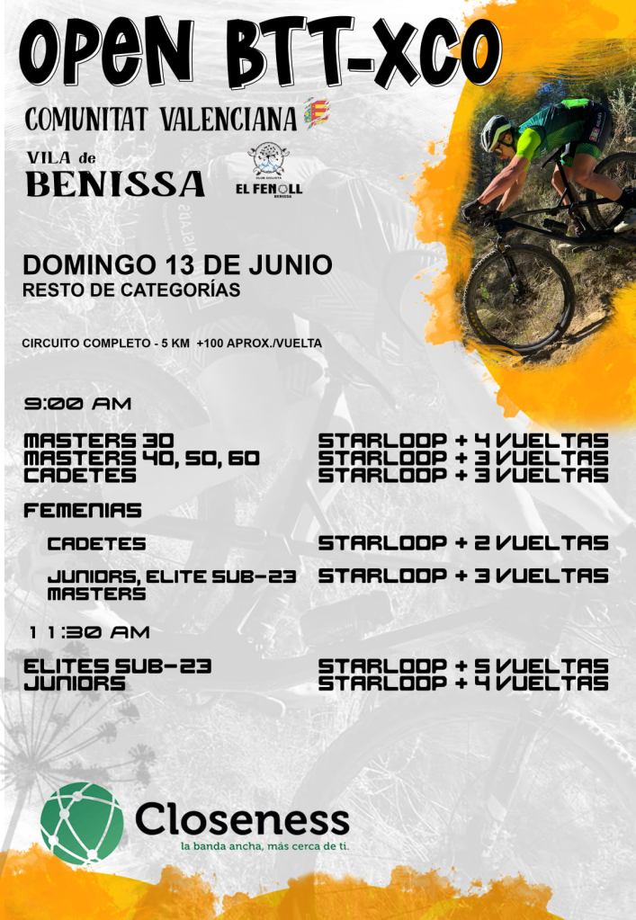 Darío Castillo (Crevillent) e Inés de la Poza (Big Bikes) fueron los ganadoras en la categoría Promesas 1; Adrián García (Víctor Cabedo) y Claudia Casares (Vall d’Uxó), en Promesas 2; Adrián Cortés (Crevillent) y Valeria Coloma (AM Sonido), en Principiantes 1; Gonzalo Muñoz (Fundación Sabater) y Erika Pérez (Crevillent), en Principiantes 2; Pere Fullana (Bernia-Xaló) y Naia Gasch (In Bike), en Alevines 1; Marcos Soriano (Crevillent) y María Ivars (Bernia-Xaló), en Alevines 2; Pepe Arqués (Xixona) y Noa Alderete (Jávea), en Infantiles 1; y Aarón Noguera (Bernia-Xaló) y Claudia Castaño (Ilicitana UC), en Infantiles 2. VER CLASIFICACIONES