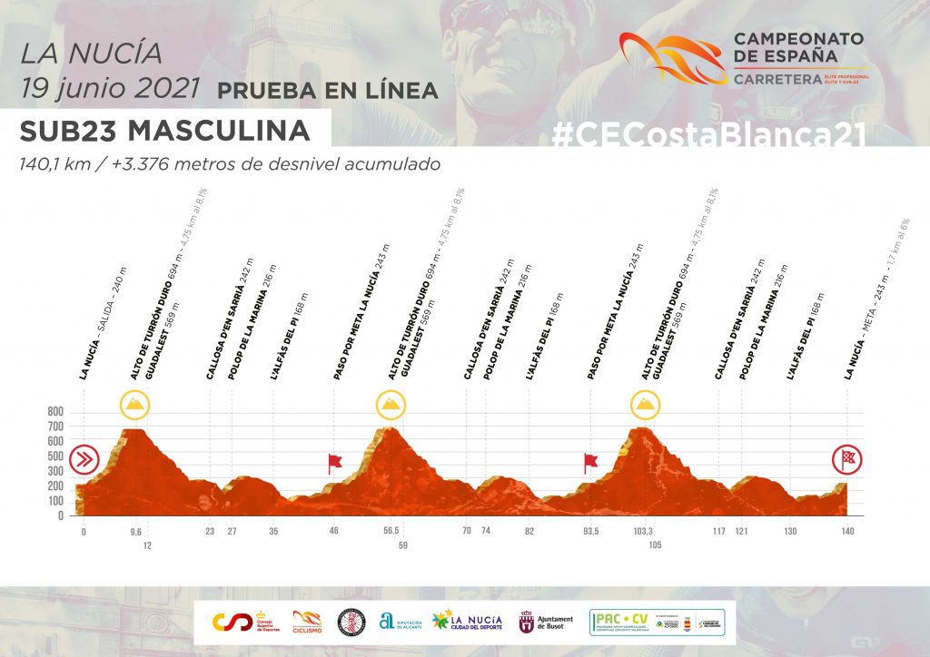El sábado 19 de junio comenzará la disputa de las pruebas en línea, con la participación de las féminas élite-sub 23 y de los chicos sub 23. Ambos pelotones desarrollarán la competición sobre un circuito que tendrá como gran protagonista el Alto del Turrón Duro, de 4,75 km al 8,1% de pendiente media, al cual las féminas tendrán que ascender en dos ocasiones, mientras que los sub 23 lo harán tres veces, antes de aproximarse a La Nucía y encarar el exigente muro que precede a la meta. Esta subida final, llamada a decidir los nuevos campeones de España, cuenta con una pendiente media del 6% en los últimos 1,7 kilómetros, pero algunas de sus rampas registran porcentajes de hasta el 9%.