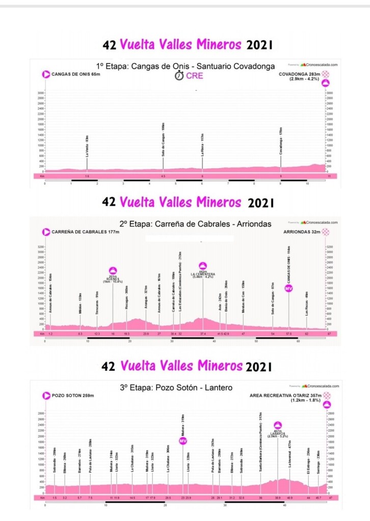 David Martínez, Alejandro Baviera, Enric Rodríguez, Héctor Álvarez, Mario Álvarez, Marc Zaragoza, Pablo Blanquer y David Ivars disputarán, con el equipo Grupo Sime-Level, los días 22, 23 y 24 de junio, la 42 Vuelta a los Valles Mineros de la categoría cadete. La ronda asturiana comienza con una contrarreloj individual que parte de Cangas de Onís y finaliza en Covadonga. Las otras dos etapas serán en línea. La segunda unirá Carreña de Cabrales con Arriondas, y, la tercera, Pozo Sotón y Lantero.