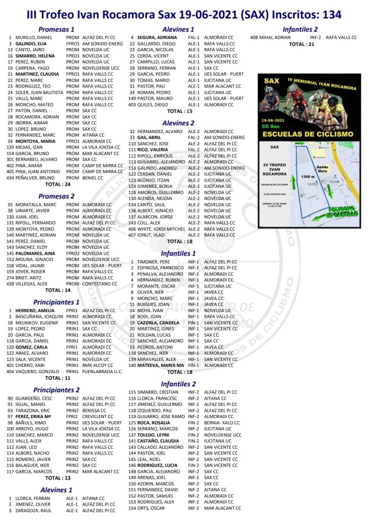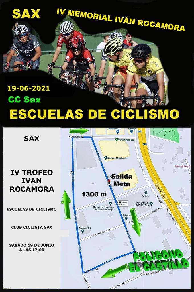 Las Escuelas de Ciclismo de Alicante disputan en Sax el sábado, a partir de las 17.30 horas, el IV Trofeo Iván Rocamora. La pasada temporada no se pudo celebrar por la pandemia y regresa con nuevos bríos recordando una vez más al gran Rocamora, que falleció en 2017 dejando detrás un gran legado después de las horas que dedicó al ciclismo, su pasión, sin nada a cambio. Infinidad de chavales aprendieron a su lado lo bonito que es el deporte del pedal y nunca lo olvidarán.