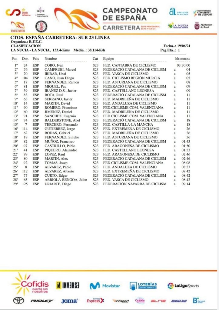 Iván Cobo (Cantabria) es el campeón de España de la categoría sub 23 que se ha disputado hoy con salida y llegada en La Nucía, tras 133,4 kilómetros de recorrido. Marcel Camprubi (Cataluña) ha sido segundo y Unai Iribar (Euskadi), tercero. Gran carrera de Eugenio Sánchez. El calpino estuvo escapado desde el minuto 14 y aguantó con los mejores hasta el final. No encontró el justo premio a sus merecimientos, `pero demostró una vez más sus virtudes como ciclista. Terminó en el puesto 13, pero sus sensaciones fueron de vencedor. Jugó ganador, pero en esta ocasión la moneda cayó del otro lado. Más de 110 kilómetros escapado, aguantando con los mejores, así lo corroboran.