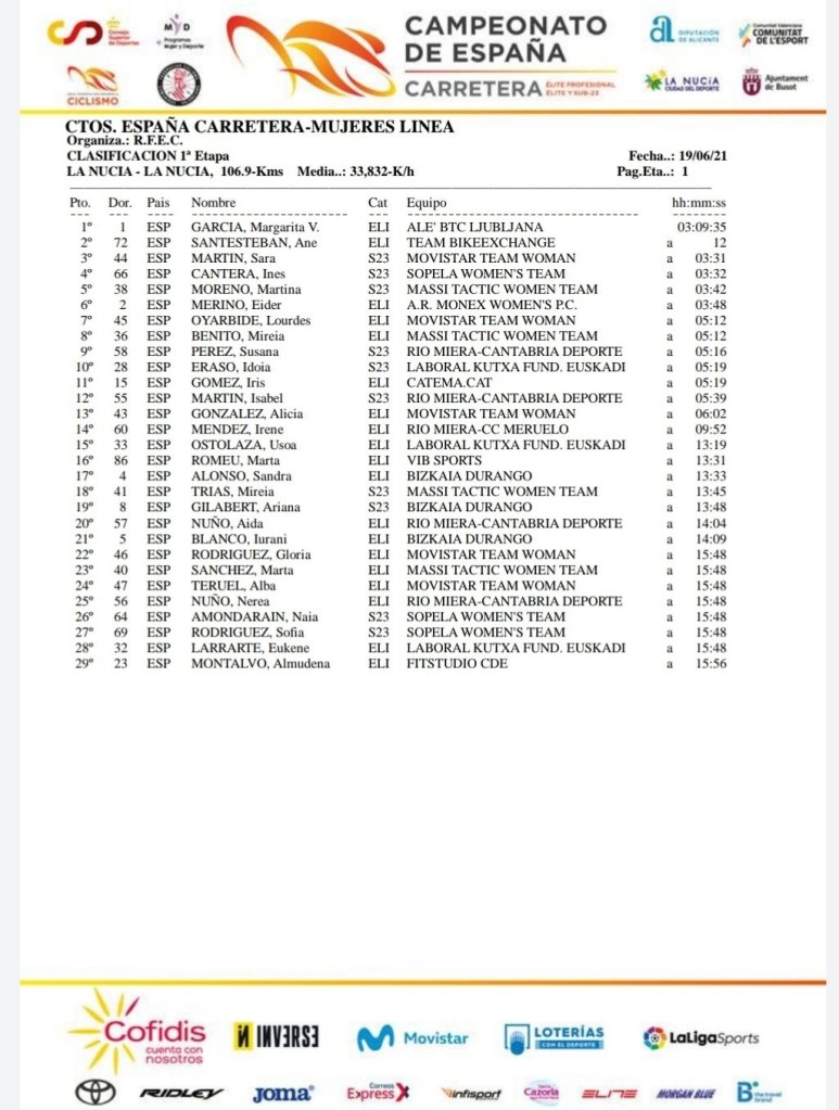 Mavi García (Alé), Ane Santesteban (Team BikeExchange) y Eider Merino (AR Monex) han formado el podio élite y Sara Martín (Movistar Team), Inés Cantera (Sopela) y Martina Moreno (Massi), el de sub 23. Marta Romeu, del Natural Greatness Vib Sports, ha entrado en el puesto 16 (10, élite) y Sandra Alonso (Bizkaia Durango), 17. “Los primeros kilómetros han sido muy duros, pero luego me he encontrado mejor”, señalaba la valenciana.
