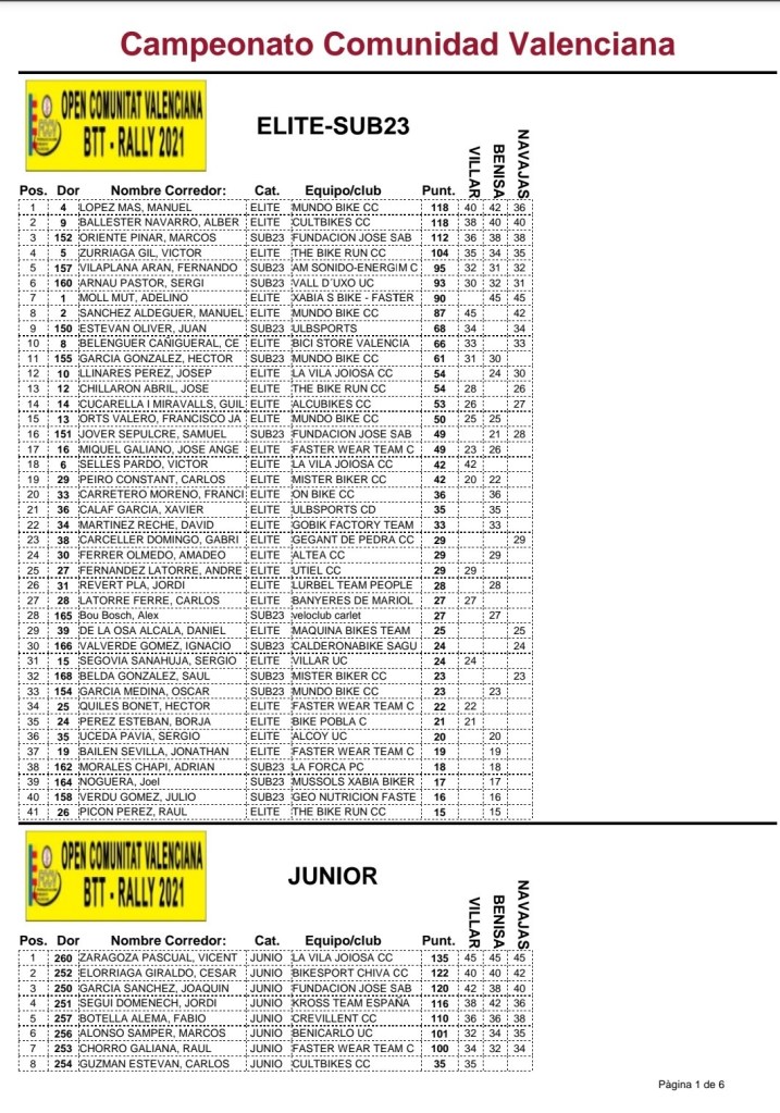 El Open BTT XCO de la Comunitat ha finalizado hoy con la celebración del XCO Navajas-Gran Premio Nutrinovx, organizado por The Bike Run CC, en el que se han conocido los campeones. Manuel López (Mundobike) y Paola Zahonero (Cultubikes) han sido los mejores élites en las tres pruebas disputadas; Marcos Oriente (Fundación Sabater) y Marta Martínez (Fundación Sabater) han vencido en la categoría sub 23; Adrián Valle (Juan Giner) y Sandra Jover (Fundación Sabater), en cadetes; Vicent Zaragoza (Cyclic) y Vania Rico (Kross Team), en júniors; Manuel Julve (Benicarló) y Saida Perea (Beniopa), en M30; Óscar Suárez (Sepelaco) y Rosa Alba (Mundobike), en M40; Antonio Iborra (Polop), en M50; y Antonio Llinares (La Vila), en M60, se han vestido con el maillot amarillo de vencedores. Por equipos se ha impuesto la Fundación José Sabater.