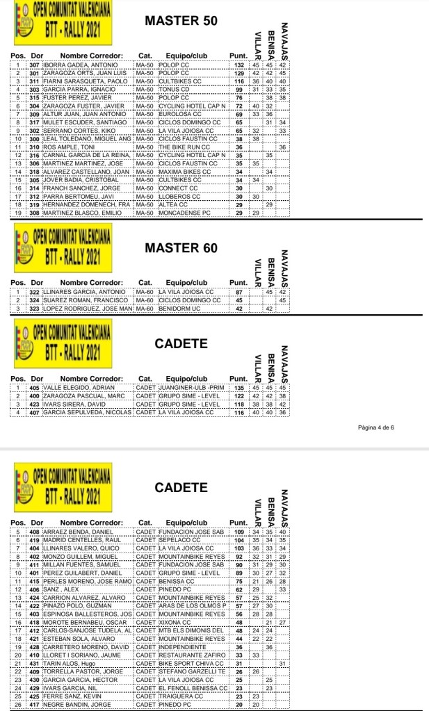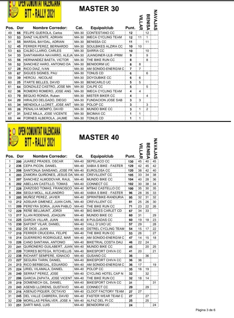 En Navajas las victorias han sido para Adel Moll (Xabias Bikes) y Paola Zahonero (Cultubikes), en la categoría élite; Marcos Oriente (Fundación Sabater), en sub 23; Vicent Zaragoza (Cyclic), en júniors; Adrián Valle (Juan Giner) y Sandra Jover (Fundación Sabater), en cadetes; Manuel Julve (Benicarló) y Saida Perea (Beniopa), en M30; Óscar Suárez (Sepelaco) y María José Berenguer (Mundobike), en M40; Juan Luis Zaragoza (Polop), en M50; y Francisco Suárez (Ciclos Domingo), en M60.