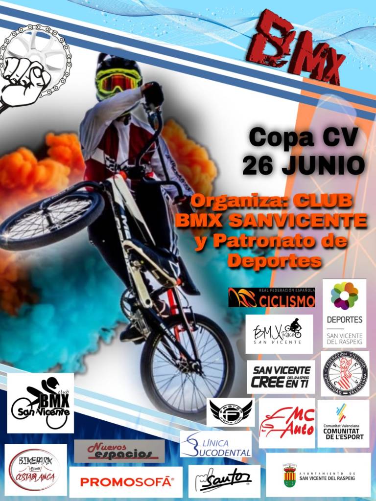 El sábado, 26 de junio, se disputa en San Vicente del Raspeig, organizada por el CC BMX San Vicente, la segunda prueba de la Copa BMX Comunitat Valenciana. El inicio está previsto para las 19 horas. Las categorías participantes son las siguientes: Promesas 7 y 8 Fem., Promesas 7 y 8, Promesas 5 y 6 Fem., Promesas 5 y 6, Principiante Fem., Principiante, Mujeres PRO 17, Mujeres de 50 y mas, Mujeres de 40 a 49, Mujeres de 30 a 39, Mujeres de 13 a 16, Master 50 y mas fem, Master 50 y mas, Master 40 fem., Master 40, Master 30 fem., Master 30, Junior fem., Junior, Infantil fem., Infantil, Hombres PRO 17, Hombres de 50 y mas, Hombres de 40 a 49, Hombres de 30 a 39, Hombres de 13 a 16, Elite-Sub23 Fem., Elite-Sub23, Challenge 17 a 29 Fem., Challenge 17 a 29, Cadete fem., Cadete, Alevín Fem. y Alevín.