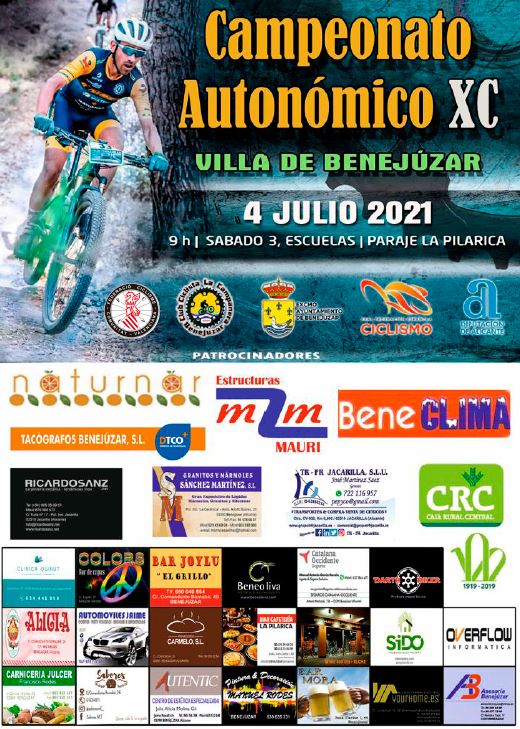 Los días 3 y 4 de julio se disputará el Campeonato Autonómico XC ‘Villa de Benejúzar’. La competición reservada a Escuelas de Ciclismo se disputará en la primera jornada a partir de las 18.30 horas y , al día siguiente, se dilucidarán los títulos autonómicos en el resto de categorías con inicio a la nueve de la mañana. El trazado del Autonómico tiene su punto de partida y final en la término recreativo de La Pilarica, ubicado en la zona deportiva del mismo nombre y situado en el sector sureste del casco urbano de Benejúzar.