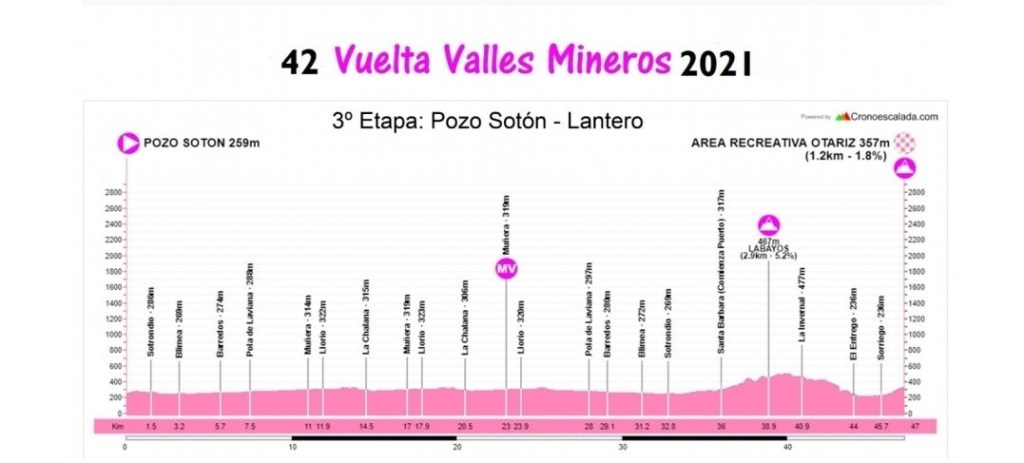 La tercera y última etapa de la Vuelta a los Valles Mineros se disputa el jueves entre Pozo de Sotón y Lantero. La salida está prevista a las 17 horas y al pelotón le esperan 48 kilómetros de recorrido.