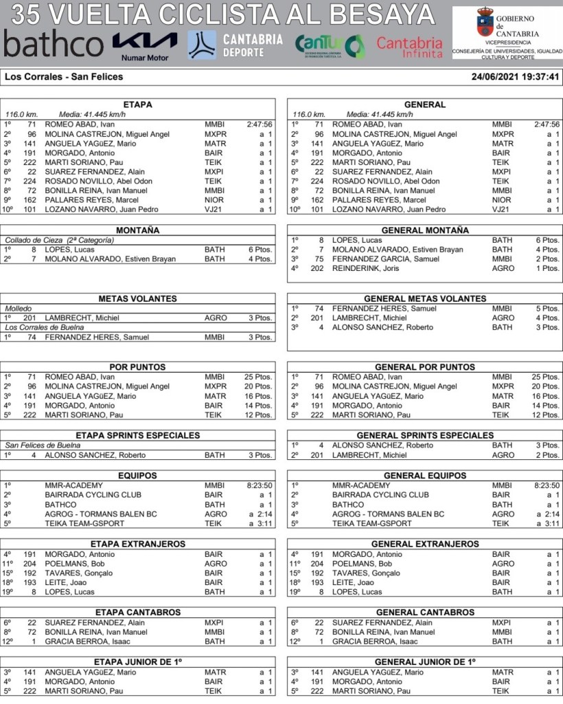 Iván Romeo (MMR Cycling Academy) ha ganado la primera etapa de la Vuelta Ciclista al Besaya júnior, de 116 kilómetros, que ha terminado en San Felices de Buelna. Ha hecho un tiempo de dos horas, 47 minutos y 56 segundos. El pucelano es el primer líder de la ronda cántabra. Llegó a meta con un segundo de ventaja sobre un grupo de 20 ciclistas entre los que figuraba el alicantino del Bathco Team Jaume Guardeño. Miguel Ángel Molina ha sido segundo y Mario Anguela, tercero.