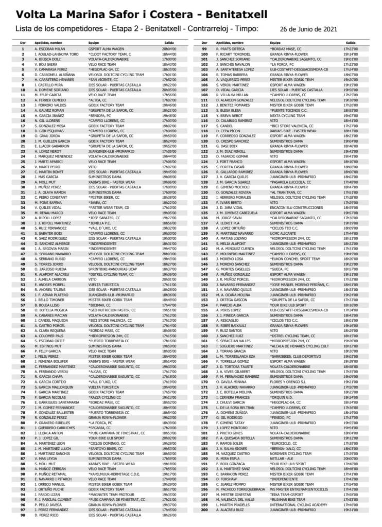 La Volta La Marina Safor i Costera ha comenzado esta mañana con una etapa matinal con salida y meta en Almoines de 66 kilómetros. La victoria ha sido al esprint para Antonio Domene (Ijes Solar) tras hacer un tiempo de una hora, 25 minutos y 34 segundos. Aitor Escobar (Gsport) ha sido segundo y David Serrano (Velosol), tercero. Domene ha sido el primer élite; Escobar ha ganado en M30; Vicente Morcillo (Sueca), en M40; Ismael Cervera (Orquín), en M50; Marc Mestre (Teika) ha sido el primer júnior; y Carolina Juárez, la mejor fémina. Esta tarde se disputa la segunda etapa. Una dura cronoescalada al Puig de la LLorença de Benitatxell de 4,8 km. La tercera se correrá el domingo en Barxeta, una carrera totalmente “rompepiernas» de 66 kilómetros.