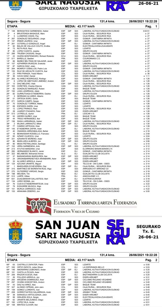 Xabier Berasategi (Laboral Kutxa) ha ganado el San Juan Sari Nagusia en Segura, de 131,4 kilómetros y puntuable para el Torneo Euskaldun de la Federación Vasca de Ciclismo. Berasategi ha llegado en solitario a meta, con Brustenga y Llaneras, del Caja Rural-RGA, a continuación. Xabier Berasategi se ha proclamado campeón de Gipuzkoa sub 23. Le han acompañado en el podio sus compañeros de equipo Unai Iríbar y Enekoitz Azparren. El la categoría élite, el título ha sido para Mikel Mujika (Filial Caja Rural), que ha superado a Oier Ibarguren (Filial Caja Rural) y de Ander Amonárriz (Laboral Kutxa). Los corredores del Netllar Alé Gonzalo Fuentes y Mikel Mujika han participado en la prueba. Por otra parte, señalar que Endika Balza (Electroalavesa) es el nuevo líder del Torneo Euskaldun.