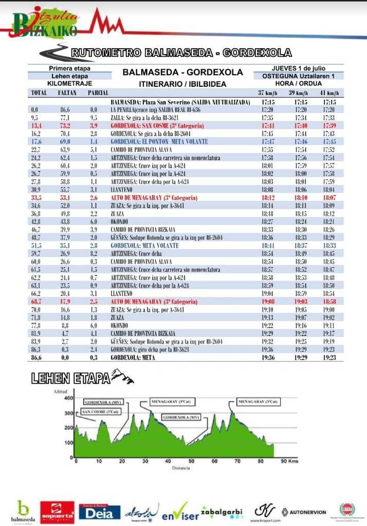 La primera etapa como es habitual comenzará en Balmaseda para ir a Gordexola y realizando por partida doble el circuito de Gordexola, Artziniega, Menagaray Okondo para volver a Gordexola, tras realizar 86.6 kms. Como en ediciones anteriores el punto caliente será Menagaray y las dos rampas previas, que romperán el pelotón para presentarse en meta un grupo de 40 o 50 corredores. A las 17.15 horas se dará el pistoletazo de salida.