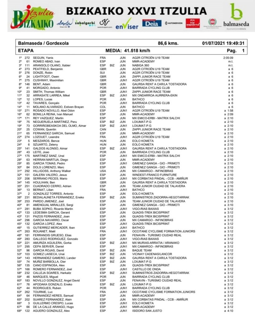 El francés Yanis Seguin (AG2R) ha sido el ganador de la primera etapa de la Bizkaiko Itzulia que ha tenido su inicio en Balmaseda y final en Gordetxola tras 86,6 kilómetros de recorrido. Iván Romeo (MMR Academy) y Xabier Aransolo (Nabiga) ha entrado a continuación con el mismo tiempo, 2-05-09. De esta forma, el líder de la prueba vasca es el corredor del AG2R. Le ha acompañado en el pódium el líder de la montaña Xabier Aransolo del equipo Nabiga 360. Quedando en la general por puntos Yanis Seguin como vencedor, en la general por equipos AG2R, en la general el primer vizcaíno y primer euskaldun es el ciclista Xabier Aransolo del equipo Nabiga 360 y el primer junior de primero con Maximilian Cushway AG2R. Marc Dolçs pasó primero por el segundo puerto de la jornada y su compañero Francisco Tejero ha abandonado debido a una caída.