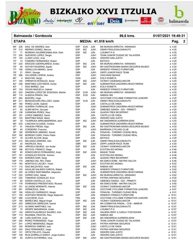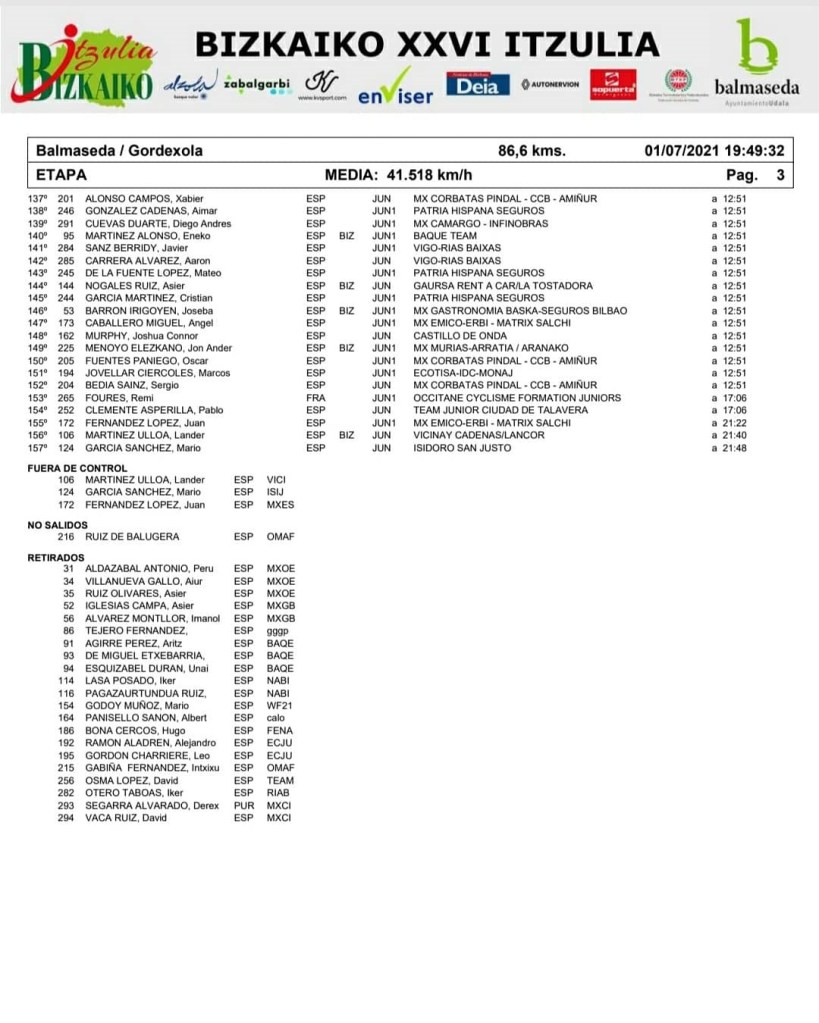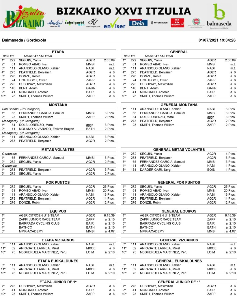 La carrera concluye con un sprint en Gordexola de los tres corredores de la cabeza de carrera dominante durante casi toda la prueba, coronándose como ganador el francés Yanis Seguin (272) del equipo AG2R Citroën U19 Team, seguido de Ivan Romeo Abad (61) de MMR-Academy, después de enlazar con la cabeza, y en tercer lugar el Bizkaino Xabier Aransolo (111) del equipo Nabiga 360.