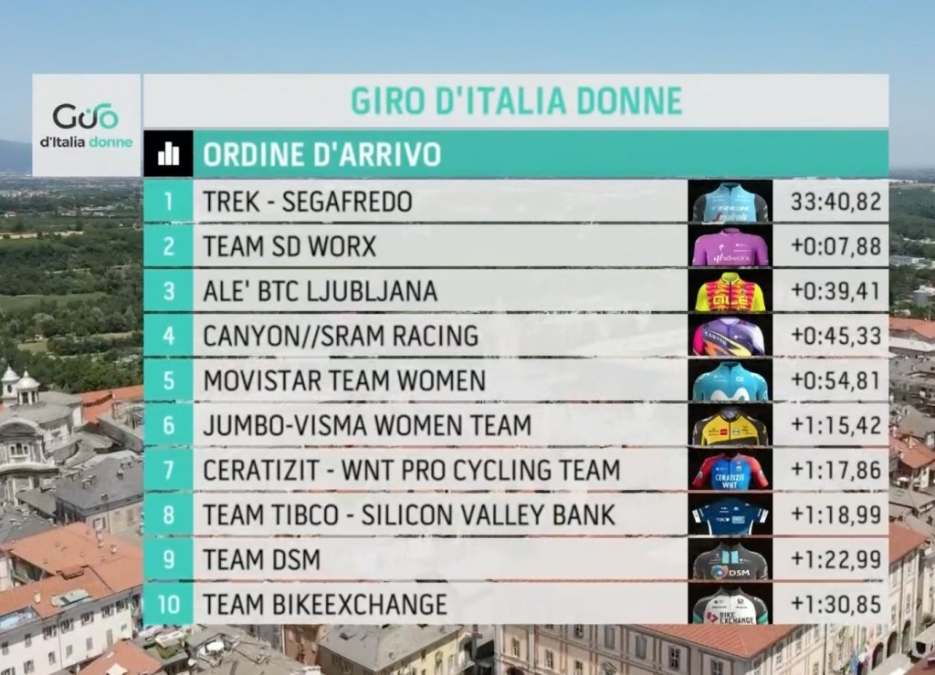 El Trek-Segafredo ha sido el vencedor de la primera etapa del Giro d’Italia Internazionale Femminile (2.Pro), una contrarreloj por equipos de 26,7 kilómetros entre Fossano y Cuneo. Ruth Winder se ha vestido de rosa.