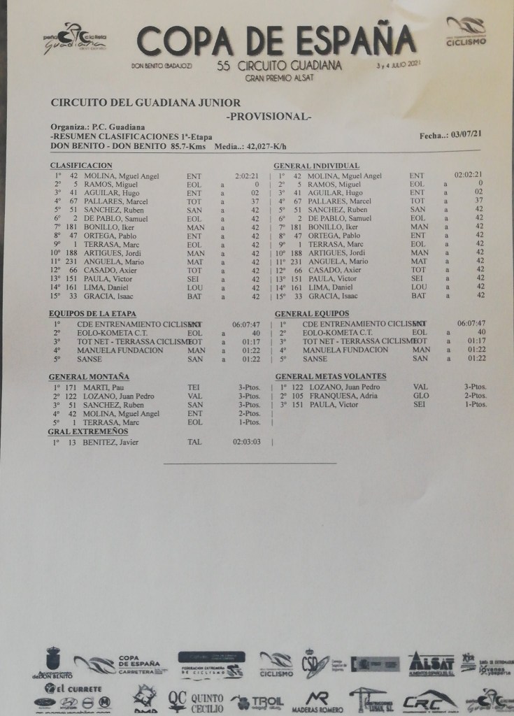 Molina, Aguilar y Ramos se jugarían la victoria al sprint tras marcharse en solitario en los últimos compases. En recta de meta, Molina se mostraría como el más fuerte por delante de Ramos y de su compañero de equipo Aguilar. Pau Martí, que ha cuajado una buena carrera buscando sus opciones, pierde el liderato del certamen en favor de Iker Bonillo, séptimo hoy en Don Benito.