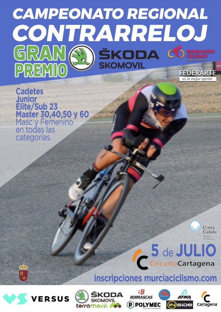 El Circuito de Velocidad de Cartagena acoge hoy el Campeonato de la Región de Murcia de contrarreloj–Gran Premio Skoda para todas las categorías. Los cadetes y las féminas comenzarán su participación a partir de las 17 horas, los júniors a los 18.50, los élite y sub 23, a las 20.00. A las cuatro comenzarán a pelear los Máster 60, 50, 40 y 30. En féminas competirán las corredoras del Cronobike Marta López (Júnior) y Ana Rocío Alfonzo (Cadetes) y categoría masculina los ciclistas cadetes del Giménez Ganga Gio Alicante Primoti Héctor García y David Ortuño, y los juveniles Pedro García y Pedro Cámara.