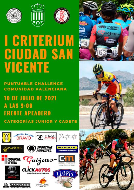 El sábado, 10 de julio, se disputa el I Criterium Ciudad de San Vicente, puntuable para la Challenge de la Comunitat Valenciana en categoría junior que lidera Dani Cepa (Infinobras Calpe) tras su triunfo en Trofeo Hogueras de San Juan-VI Memorial Domingo Canet. Después de las carreras disputadas en Genovés y Jávea el corredor de Ondara suma 70 puntos, cuatro más que Raúl Llacer (Teika) y de Pau Martí (Teika), que comenzó la competición ganando el Trofeu Sant Pascual disputado en Genovés.