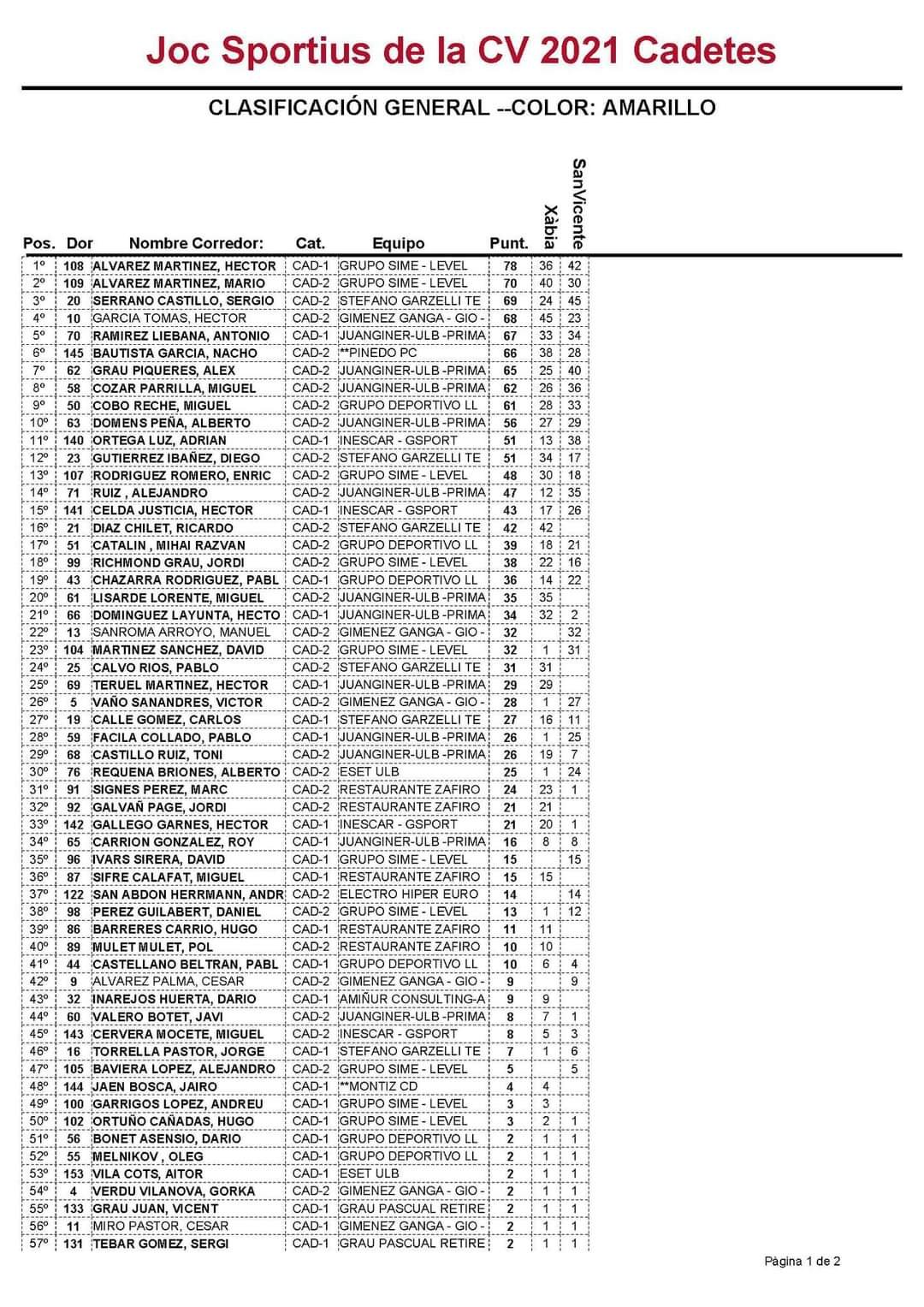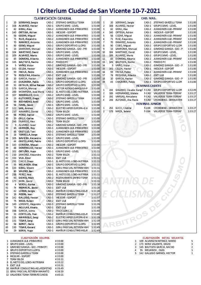 Sergio Serrano (Stefano Garzelli) se ha impuesto en el I Critérium San Vicente del Raspeig para la categoría cadete. Héctor Álvarez (Grupo Sime) y es el nuevo líder de la Challenge de la Comunitat. En júnior femenino se ha impuesto Cristina Succi (Grupo.Sime) por delante de Selena Maza (ValverdeTeam). Y en la cadete femenina se ha impuesto la corredora del GD Llopis Claudia Xiangfe Galiano.