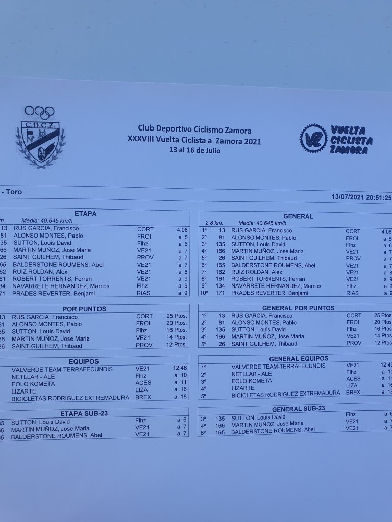 Sutton estaba contento con el resultado, pero es ambicioso y afirma que aspira a lo máximo en esta Vuelta a Zamora. «Fue un recorrido muy duro, lleno de baches y con muchos adoquines. Trate de ir suave en las zonas peligrosas para evitar una caída y fuerte en el resto de un recorrido muy corto. Estoy muy feliz y espero ganar la General», apuntaba el británico, que no recogió el maillot de primer sub 23 ya que tras finalizar su participación en la crono se marchó al hotel. Su jersei lo recogió su compañero Miguel Juan.