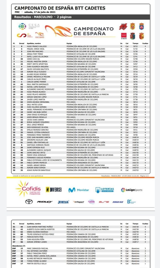 En la categoría masculina cadete ha ganado el andaluz Hugo Franco por delante de los corredores de Baleares Miguel Cerdá y Jon Mir. Adrián Valle ha terminado en el puesto 13; David Ivars, en el 30; Daniel Arráez, en el 48; mientras que Marc Zaragoza ha abandonado porque arrastraba un fuerte resfriado y se ha quedado sin fuerzas.
