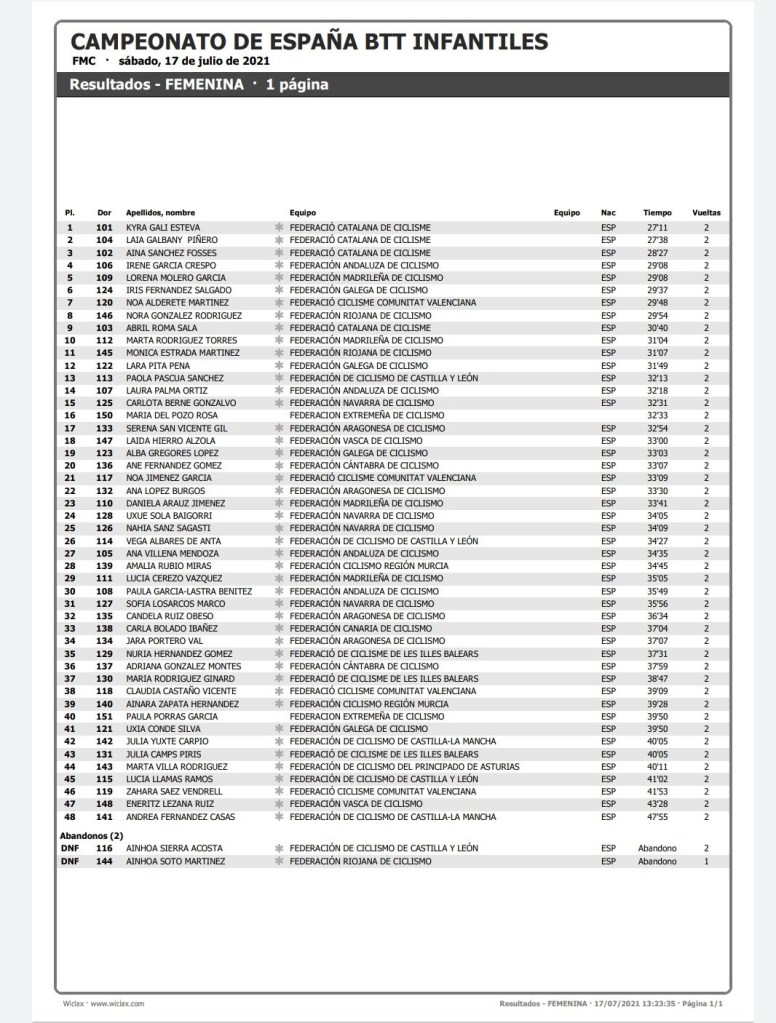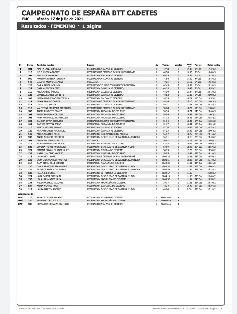 En féminas las catalanas han copado el podio. Krya Gali ha sido primera, Laia Galbany terminó segunda y Aina Sánchez, tercera. Noa Alderete ha sido séptima; Noa Jiménez, ha entrado en el puesto 21; Claudia Castaño, en el 38; y Zahara Sáez, en el 46.