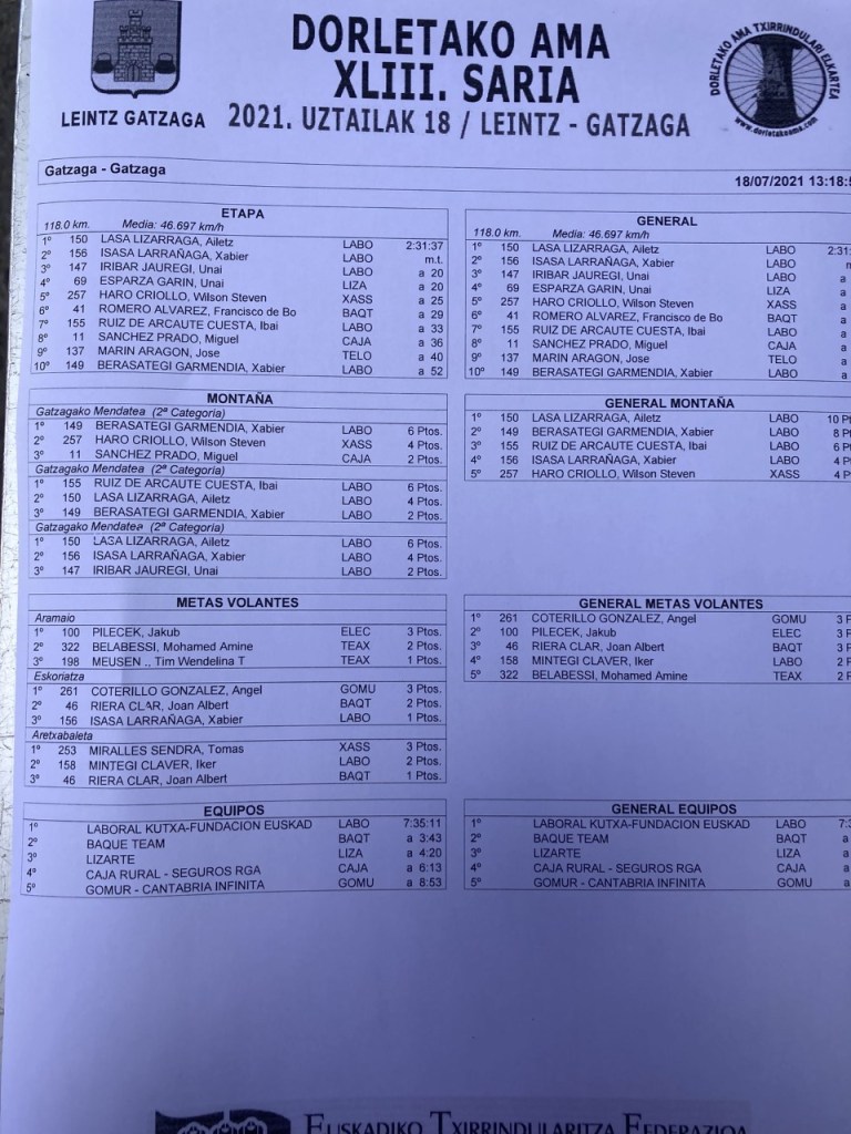 Ailetz Lasa (Laboral Kutxa) se ha impuesto en la 43ª Dorletako Ama Saria, cuarta fecha del Torneo Euskaldun. El corredor vasco ha llegado en solitario a la metasituada en la mítica subida de Salinas de Léniz y ha parado el reloj en las dos horas, 31 minutos y 37 segundos. Su compañero de equipo, Xabier Isasa, ha sido segundo, con el mismo tiempo, mientras que Unai Iribar, que ha completado el podio, ha llegado a 20 segundos. El corredor del Essax Wilson Steven Haro ha finalizado quinto. Lasa también se ha adjudicado el premio de la montaña, Ángel Coterillo (Gomur) las metas volantes y el Laboral Kutxa ha sido la mejor escuadra. El equipo Essax trabajó duro para evitar la fuga y tratar de jugarse todo al esprint. Tomás Miralles pasó primero por la meta volantes de Aretxabaleta.