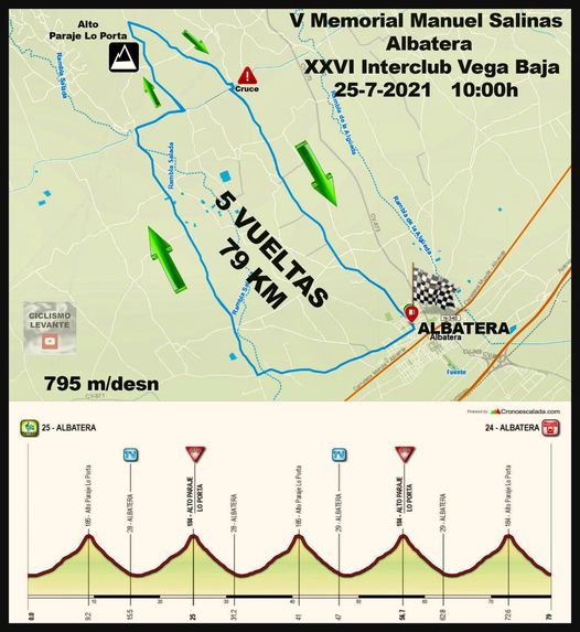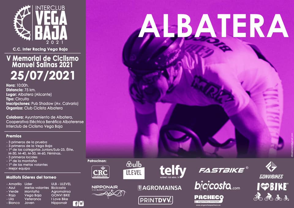 El domingo, día 25 de julio, se corre en Albatera la sexta prueba puntuable del Interclub Vega Baja, el V Memorial Manuel Salinas, a partir de las 10 horas. La prueba tendrá salida y meta en la Avenida del Calvario, Pub Shadow. Se darán cinco vueltas a un circuito semiurbano con subida a la Sierra de Albatera, hasta completar un total de 79 kilómetros. El recorrido es muy exigente.
