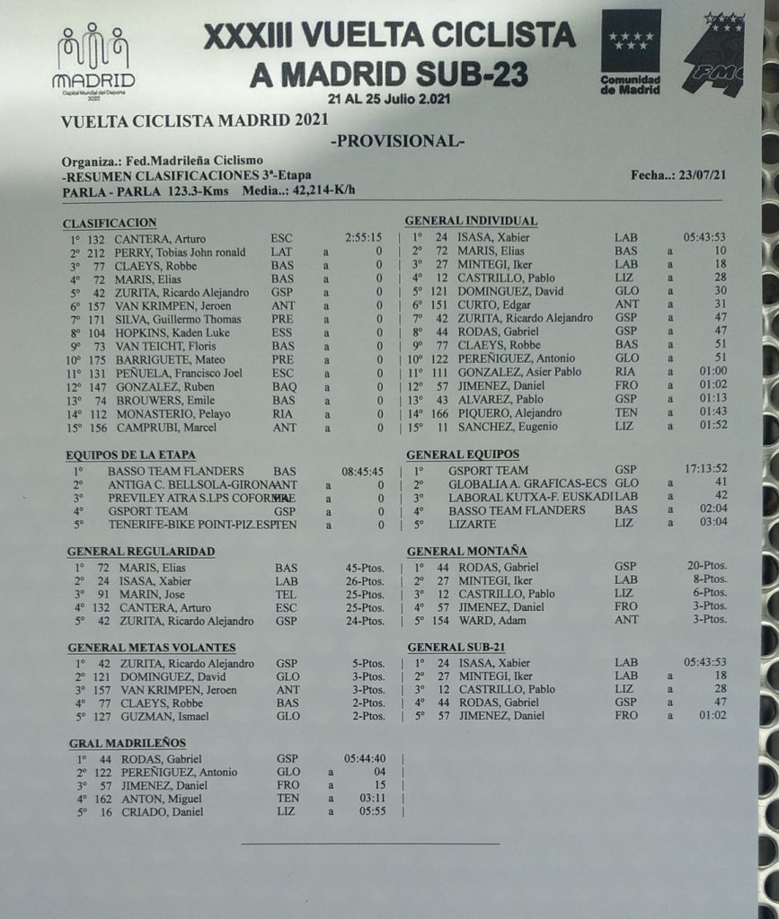Arturo Cantera (Escribano) ha sido el ganador de la Vuelta Ciclista a Madrid disputada sobre 122,1 kilómetros con salida y meta en Parla. Xabier Isasa sigue de líder aunque se ha visto involucrado en una caída.